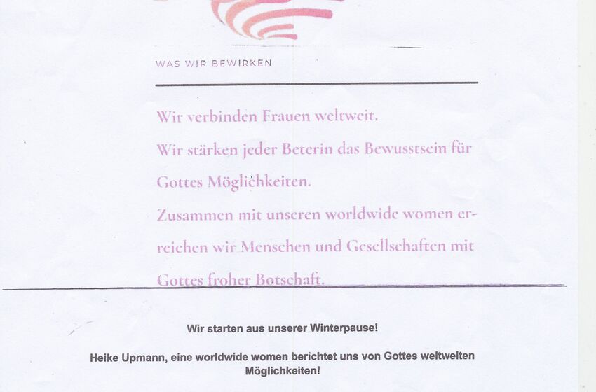 Heike Upmann berichtet von Gottes weltweiten Möglichkeiten. Dazu lädt die Frauen-Gebets-Bewegung herzlich ein.