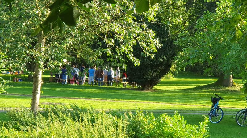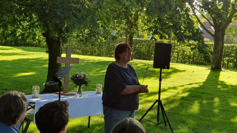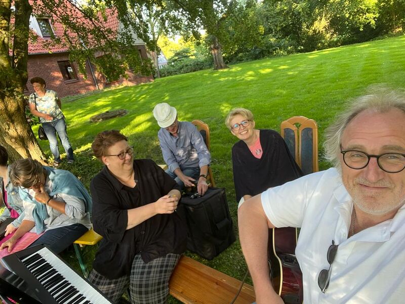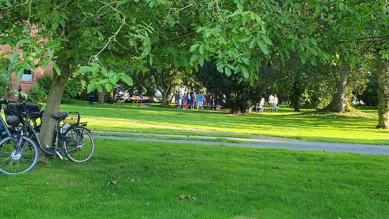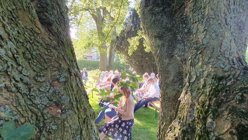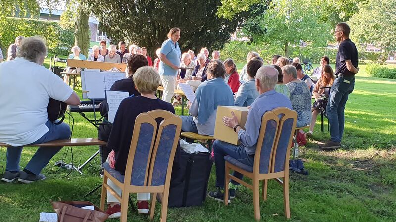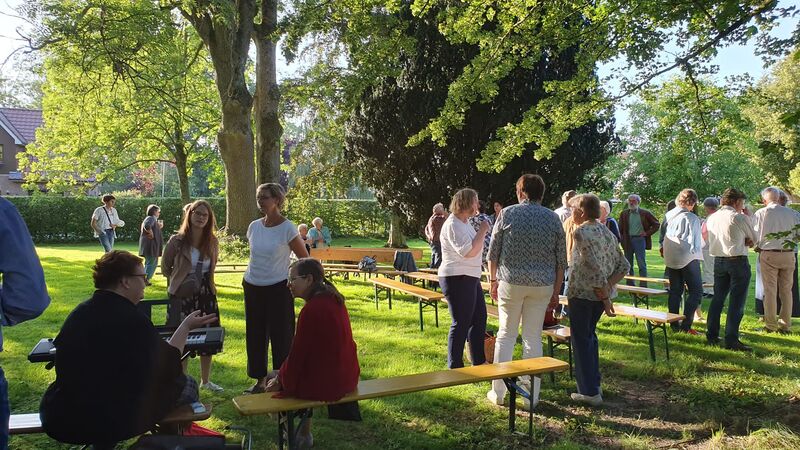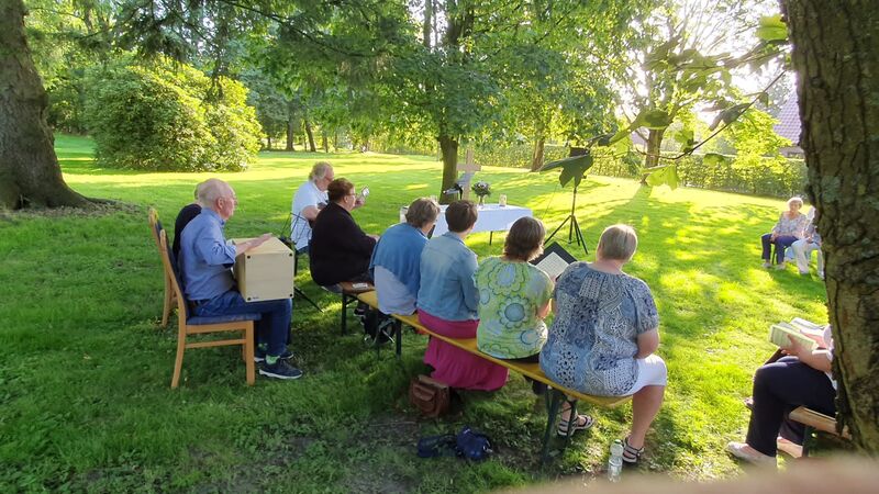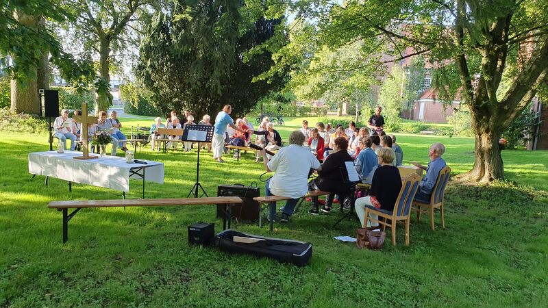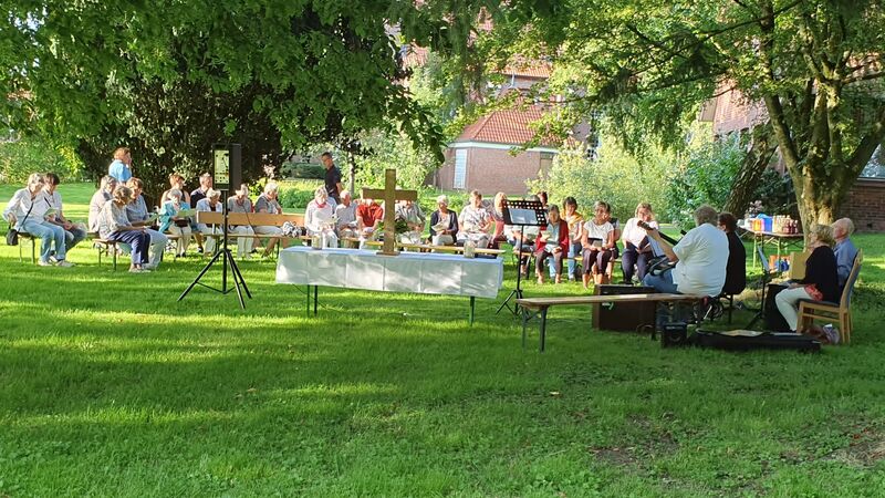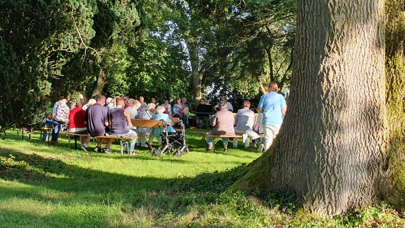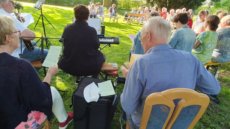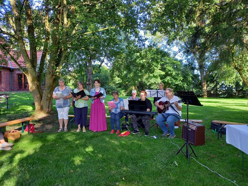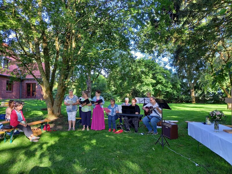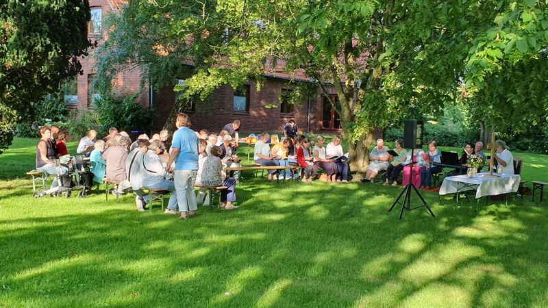 Auch dieses Jahr fand wieder eine Abendandacht in unserem wunderschönen Pfarrgarten statt. Und wieder hatten wir einen schönen Abend bei bestem Wetter. Die Besucher von fern und nah kamen zu Fuß oder mit dem Auto, aber auch das Fahrrad wurde von einigen genutzt. Claudia Rambow und Anja Olbort gestalteten die Andacht durch Texte mit Gartenbezug. Ebenso wurden Lieder passend zum Sommer und Garten gesungen. Ein kleiner Projektchor unterstützte alle beim Gesang. Gudio Goedecke und Rainer Tietje schafften einen tollen musikalischen Rahmen.
