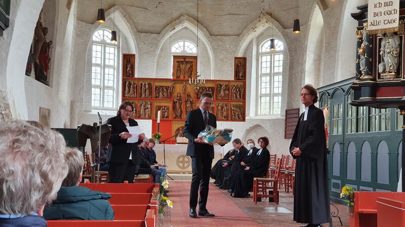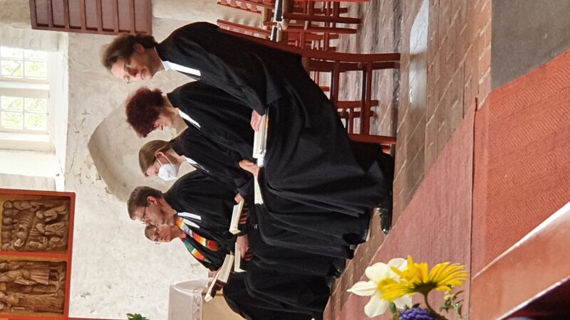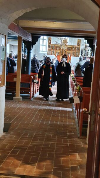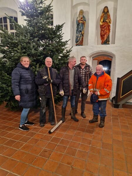 Alex Hafner bekommt (umsonst!) den Radlader von Klaus Wist, die Baumsäge ist von uns, Alex Hafner sägt und lädt den Baum auf den Radlader, der aber, oweh! den Geist aufgibt. Ersatzteile werden herbei telefoniert, Alex repariert in Windeseile das Gerät und ab geht es zur Kirche. Der Baum ist so prall, daß er kaum durch die Türe paßt und ordentlich nadelt, bis er dann doch glücklich im Inneren landet. Es wird also gefegt und gesägt, bis der Stamm in den Ständer paßt und nun: siehe Foto, sind alle froh, daß der Baum nun so prächtig aussieht und sich für Weihnachten bereit macht. Fehlt nur noch der Schmuck, der kommt morgen dran, wenn der Baum trocken ist.