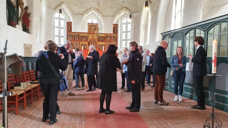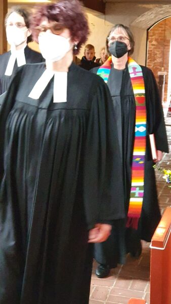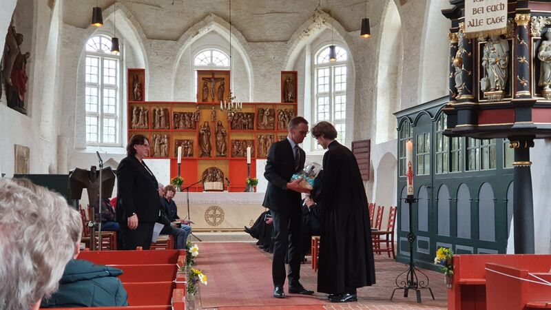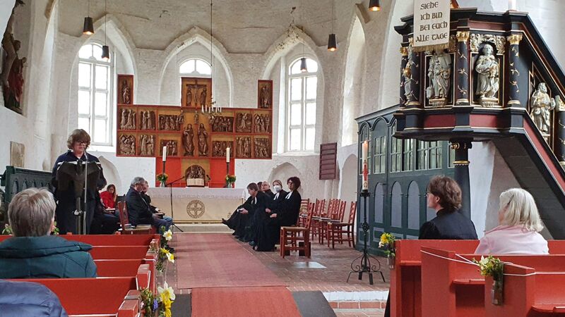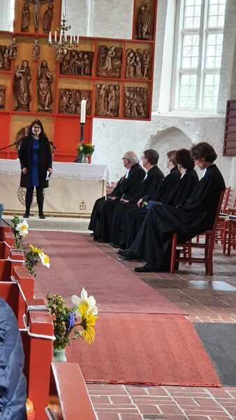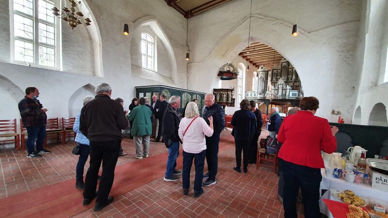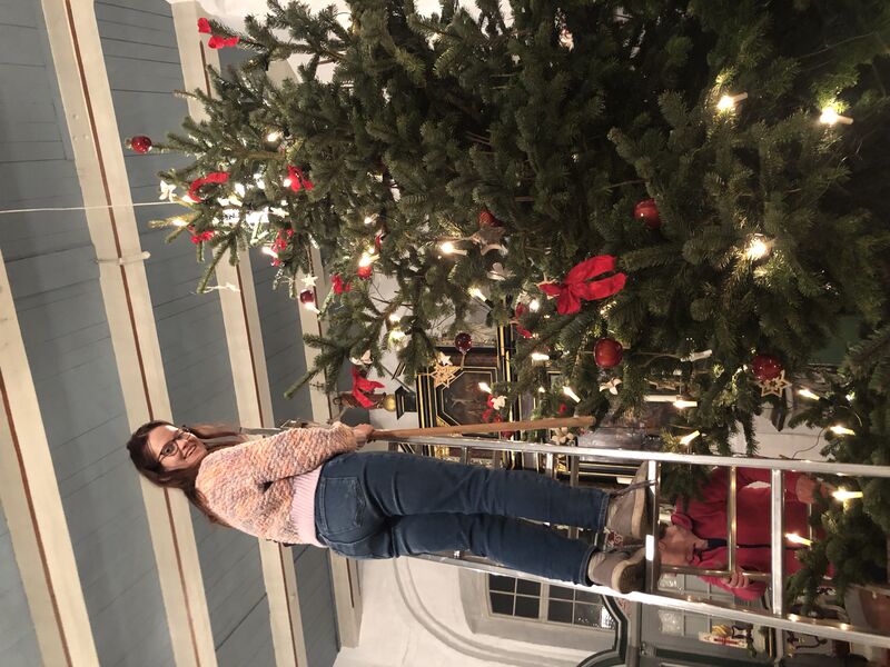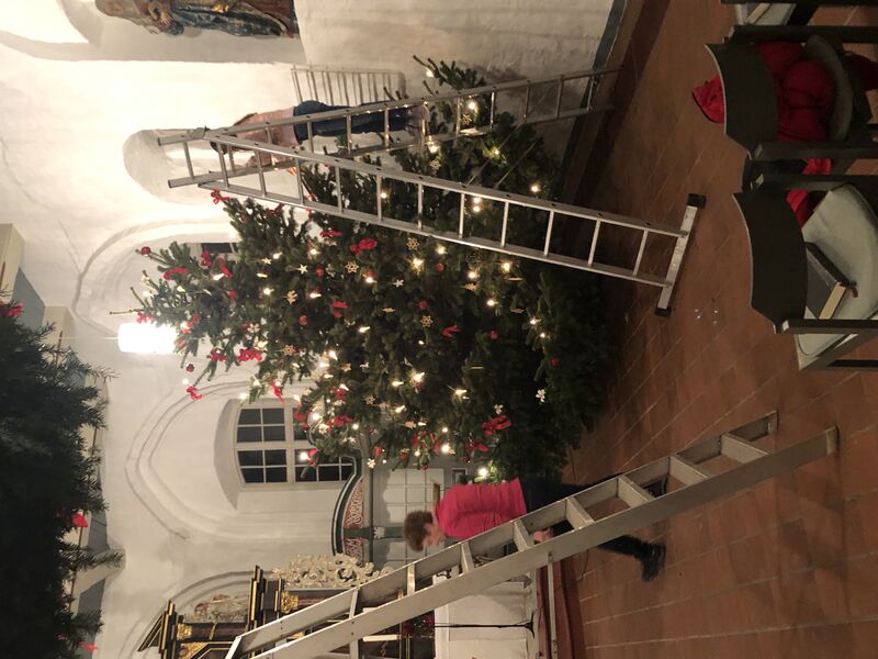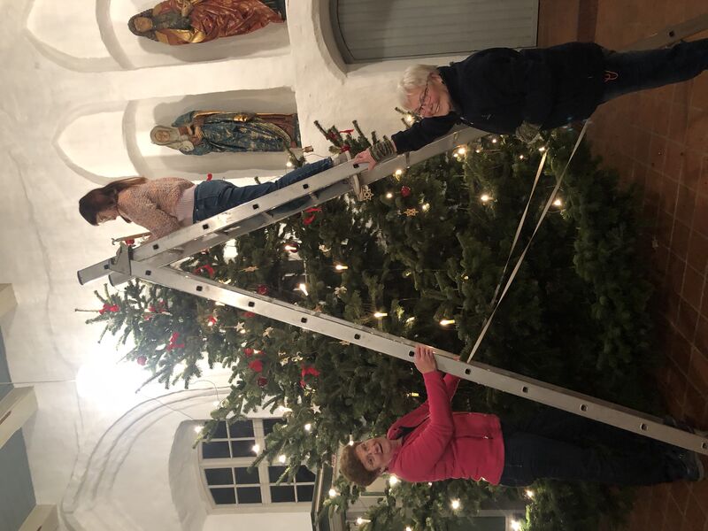 Am nächsten Nachmittag: Auftritt der seit Jahrzehnten im Baumschmücken erfahrenen Damen- Brigade : Marlies Tietje und Ria Scholtissek mit dem Lehrling Nynke Giese, die zum ersten Mal dabei ist. Sie stellt sich so geschickt an, daß man ihr gleich den Meisterbrief überreichen möchte! Schwupps, auf die Leiter, hurtig wie ein Eichhörnchen. Auch die beiden anderen Damen sind fleißig bei der Arbeit, das sieht man prima auf den Bildern. Nach zwei Stunden ist es geschafft! Der Baum ist wunderschön und leuchtet dem Weihnachtsabend entgegen.
